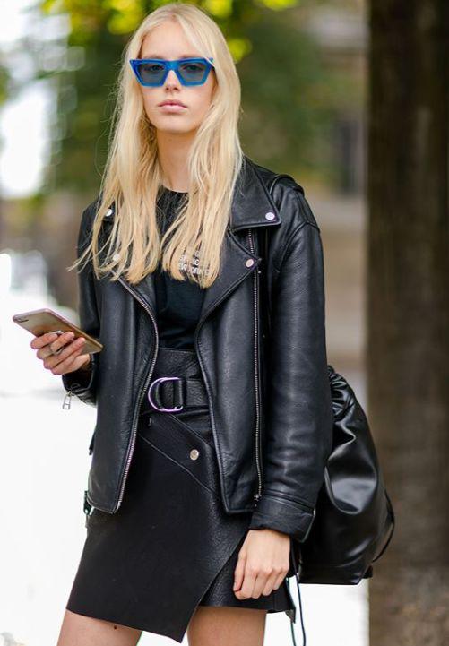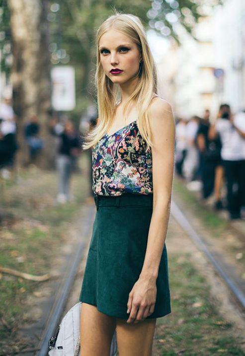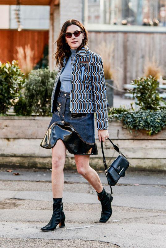当短裙的设计感丰富之后,整体的搭配也要相应的来改变。