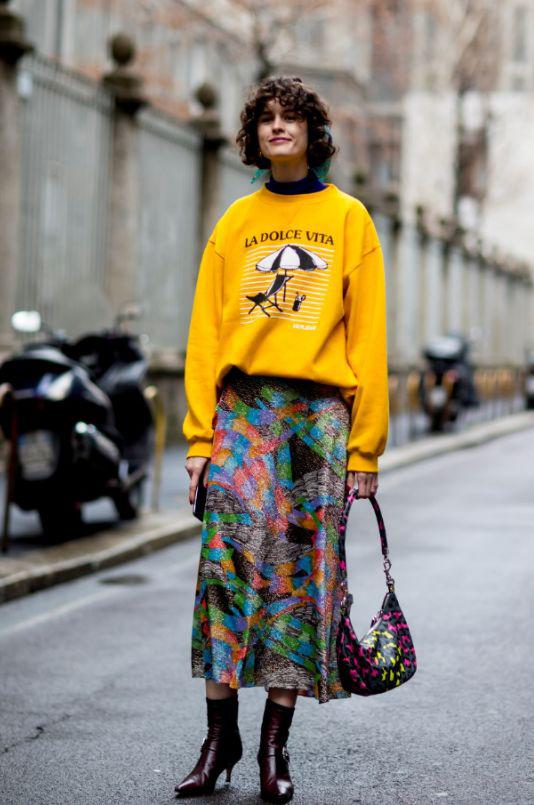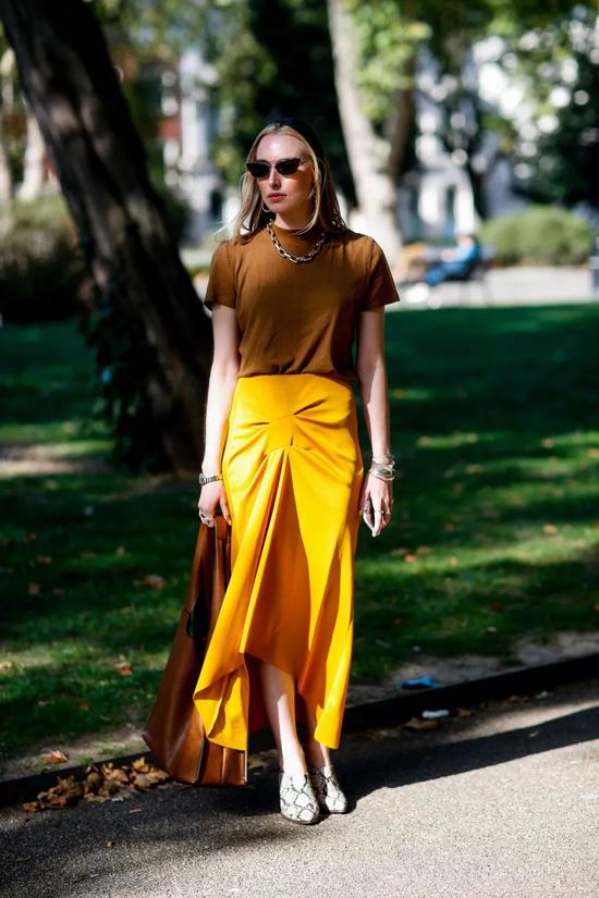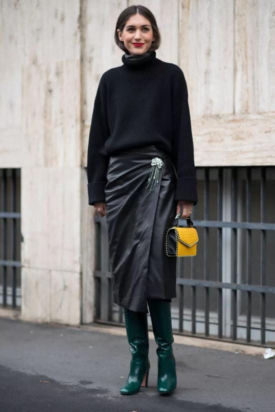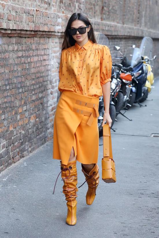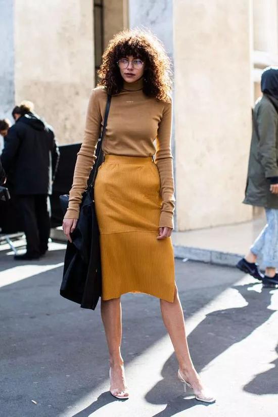 Total姜黄色的Look,本就吸睛指数极高,而用中筒靴来搭配中裙,只留出膝盖附近的些许肌肤,这是时髦精本精了吧。