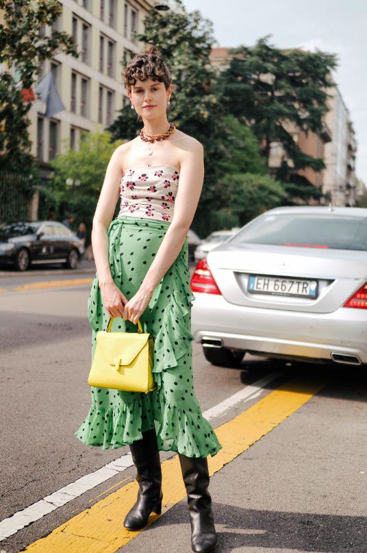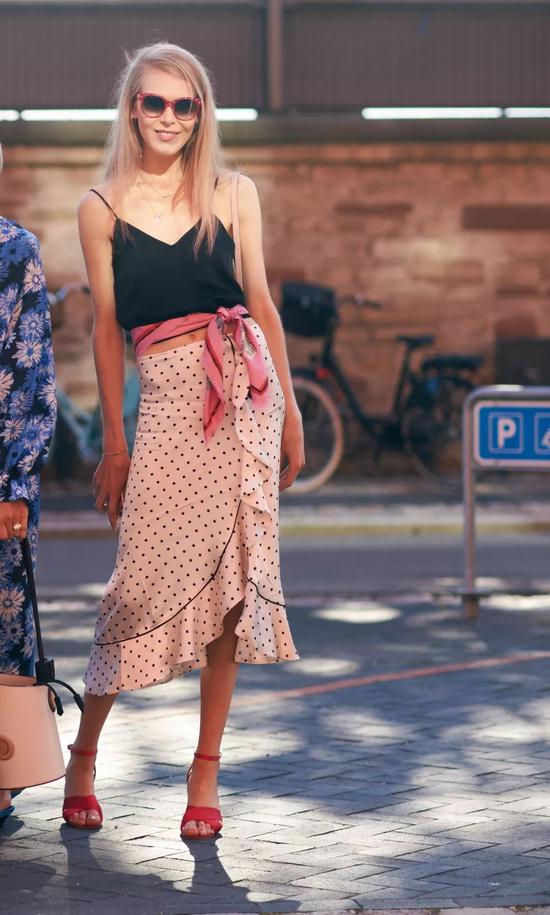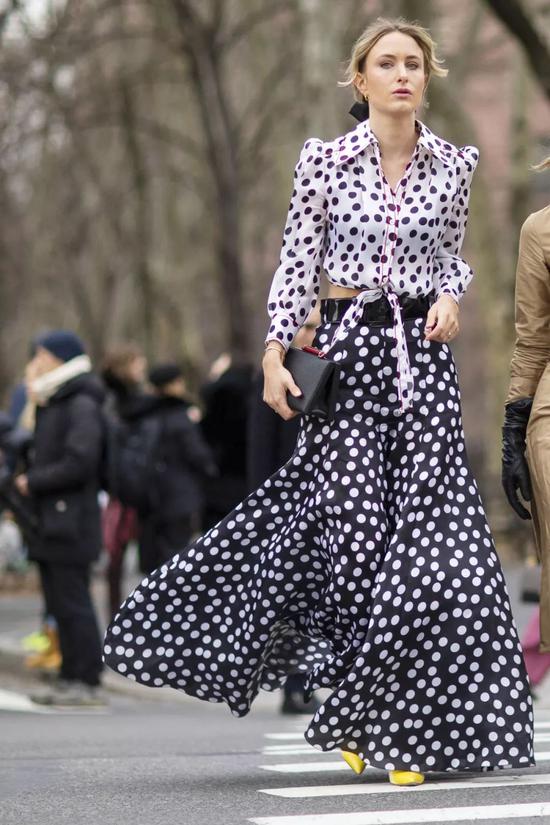 丝巾材质的波点款及地裙,搭配同样的波点样式短衬衫,颜色上通过鞋子的荧光黄色来提亮,趣味与品味同在。