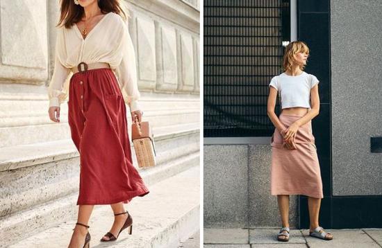 膝盖以下的中裙款,更随意休闲一些,遮住了三分之二的腿部,无形之中帮你“瘦身”。