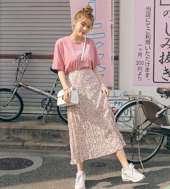 运动鞋最百搭,各种风格皆可演绎。白色运动鞋搭配碎花裙和粉色蛋糕裙,都是可爱柔美风。