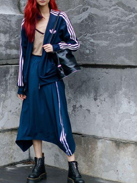而厚底的马丁靴搭配了一条运动风的不规则剪裁及踝裙,运动时尚之外增添了几分飒气。