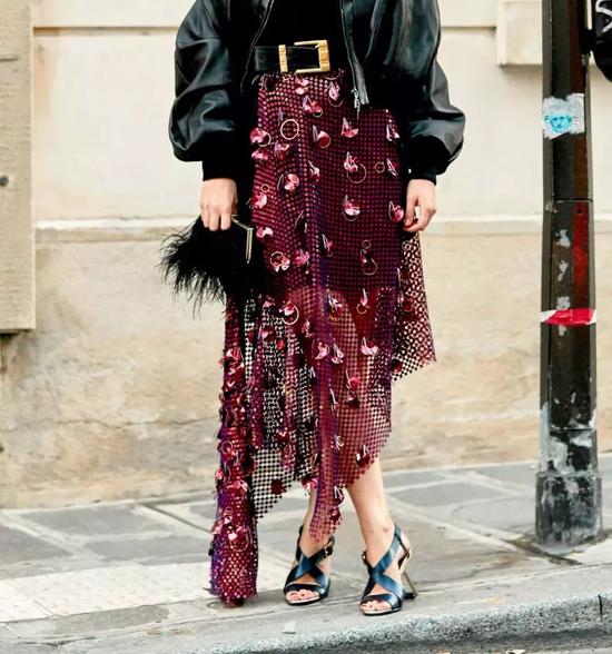 中长款的半裙加上一点开叉和不对称设计,气场足够强。隐约之间露出的腿部肌肤,又透露出点点性。