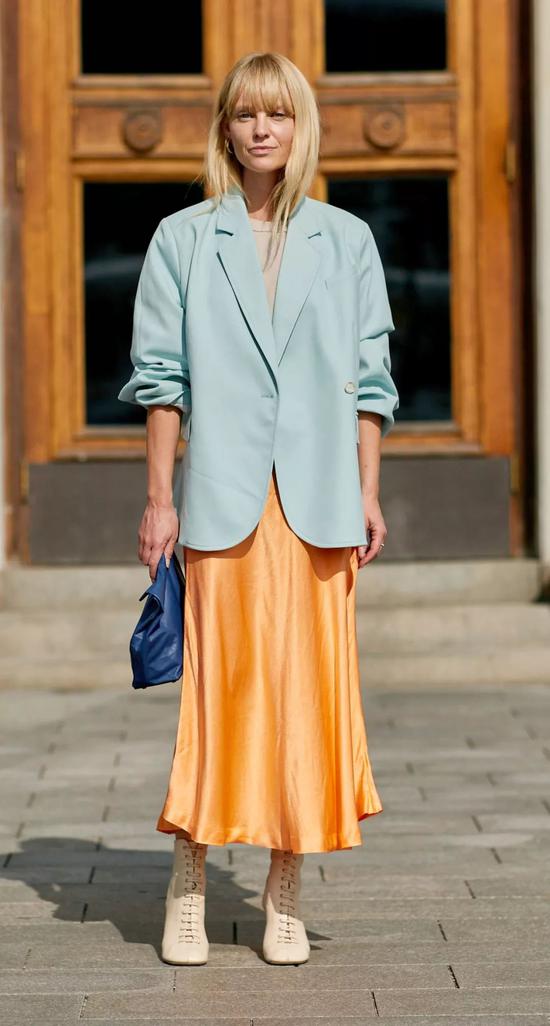 露出膝盖的中裙款,以其恰到好处的性感,表露出穿搭者的成熟魅力。