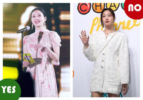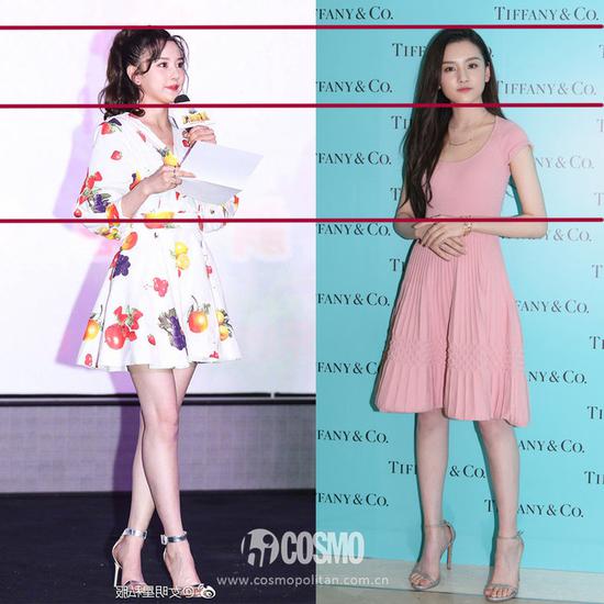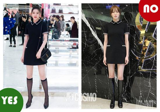 有比较更有说服力,Saint Laurent这条连衣裙秀场上是H型的设计,模特出身的李圣经直接照搬秀场演绎的,身高165的宋祖儿把裙型改成了收腰的X字型,瞬间显瘦不少。