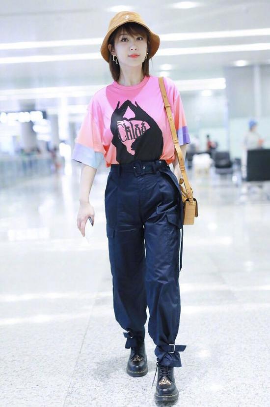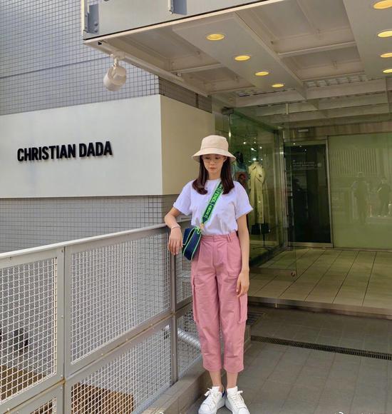 除了深色的工装裤,还有特别少女心的粉色工装裤哦。沈梦辰近日出去旅游就穿了这一身穿搭,虽然简单但是却特别有小女生甜美的气息哦~上半身一件白色的短袖T恤,下半身搭配了一条粉色的工装裤,两者搭配在一起甜美又清纯,脚上一双小白鞋,也是清新动人了,这一身穿搭比深色的工装裤搭配起来更加少女心一些哦!