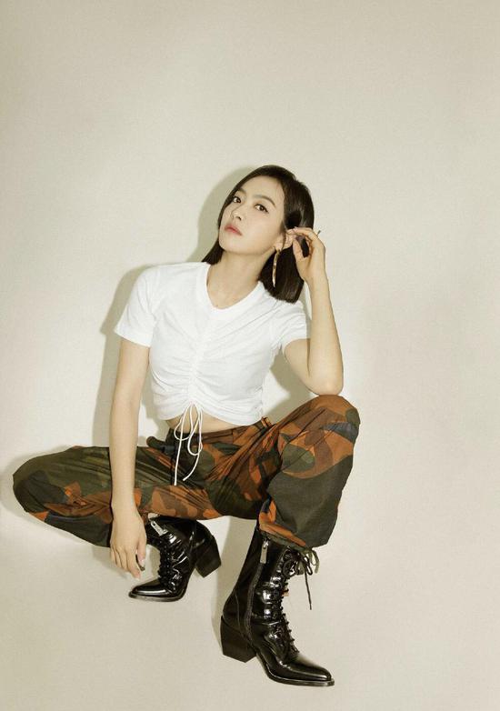 宋茜身穿一件白色的短袖T恤,T恤胸前的收褶设计,将宋茜修身的身材完美的勾勒出来,从而还露出她白皙的肚子,看起来十分的吸睛。下半身搭配了一条迷彩图案的工装裤,白色与迷彩搭配在一起,个性又百搭。脚上搭配了一双黑色的系带靴,为这身搭配增添了不少的痞帅风。
