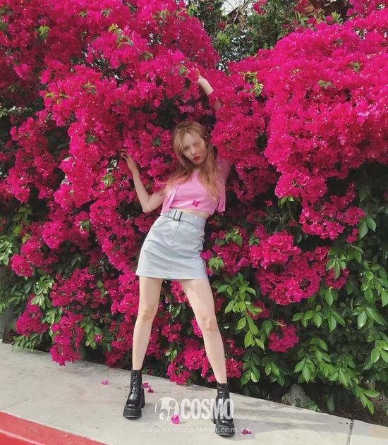 泫雅化身加州少女演绎了夏日花丛造型,粉色T恤搭配迷你短裙,充满少女气息,一双黑色厚底鞋拉长了身材比例,天啦噜,欧尼的身材真的是绝了…