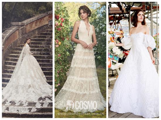 本次婚纱周可以看到不少充满浪漫情怀的婚纱,精美绝伦的刺绣、层层堆叠的薄纱、可爱的泡泡袖无一不体现出少女心,仿佛坠入梦幻云端。这样的婚纱穿在身上在婚礼当天绝对是全场的焦点,柔美又优雅,是独一无二的小公主。