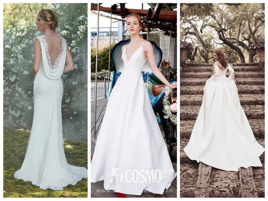 没有过多装饰的极简款婚纱通常会采用质感细腻的缎面材质,自然流露出高级的女王范儿。精致的剪裁成为极简款婚纱最重要的细节,简约的廓形糅合V字的设计更能体现出优雅的女人味。