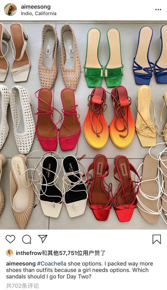 是的,秘诀永远在鞋子上。对于那些资深、骨灰级的时装精来说,高跟鞋才是无法割舍的心头好,穿上一双好鞋整个人都能时髦一大截。看看今年Aimee Song参加Coachella音乐节的行头就知道了,带的鞋子比衣服多得多!