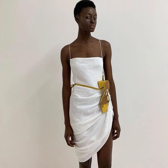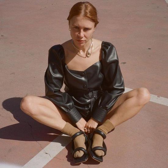 纯素皮革系列大火之后,创始人Sandra Sandor又创新地将这种材质运用到鞋子上,在Nanushka 2019 度假系列推出了Gesha方头凉拖,给休闲慵懒的夏日单品增添了酷感。