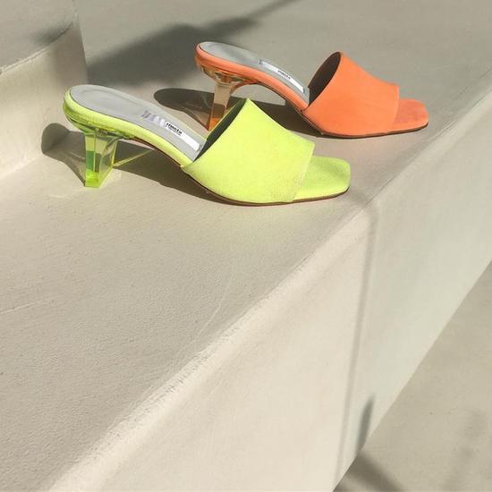 Miista还喜欢在鞋跟上做文章,犹如果冻质地的透明鞋跟撞上荧光色,也是夏天里搭配衣服的首选!