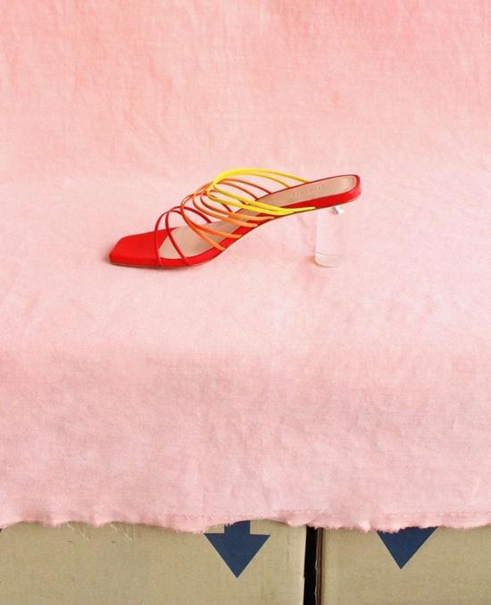 秀场上这款Zoe Sandals除了有纯白和绿色,红色这双也很别致,极细的绑带加入赤橙黄三种配色,很像是彩虹的光谱。