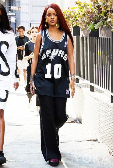 当然选择有点垮的长裤也不是不可以,比如蕾哈娜穿的黑色喇叭裤,走在街头给人很飒的感觉。