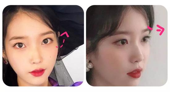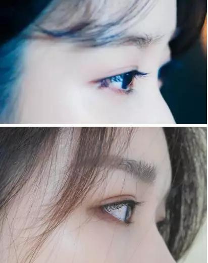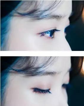 先说眼妆,这次IU的眼妆无论是眼影还是眼线都没有被着重强调,反到是睫毛有不同的两种,一种是像IU平时很多妆面一样夹的根根分明,像太阳花一样上翘(左图)。