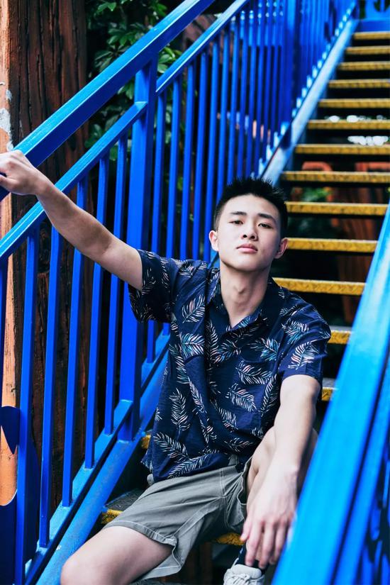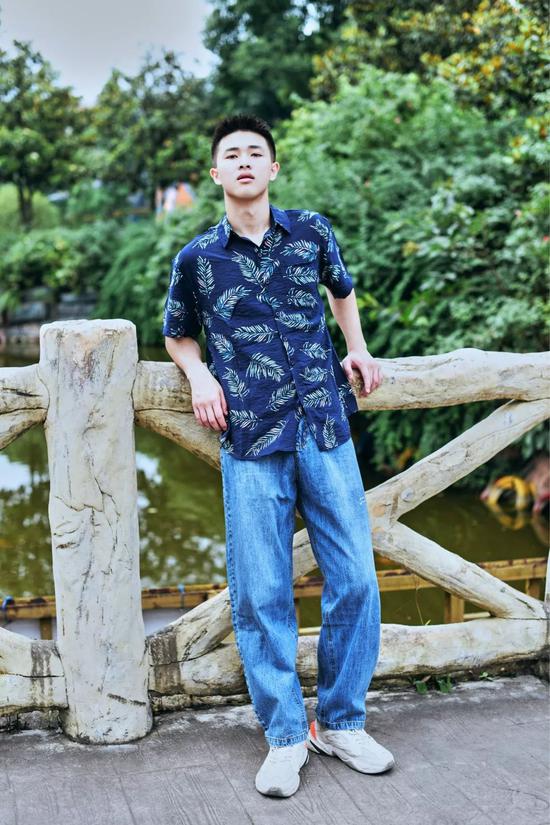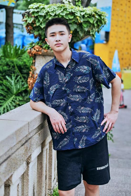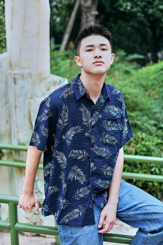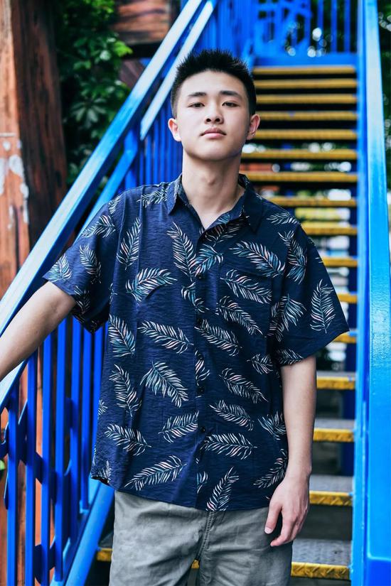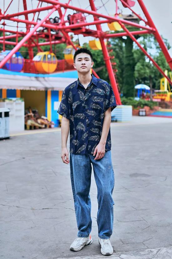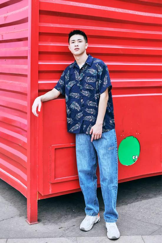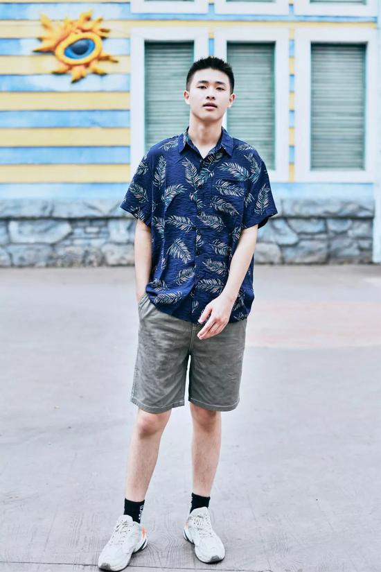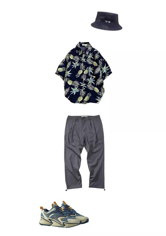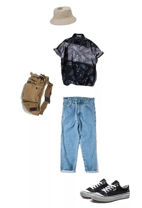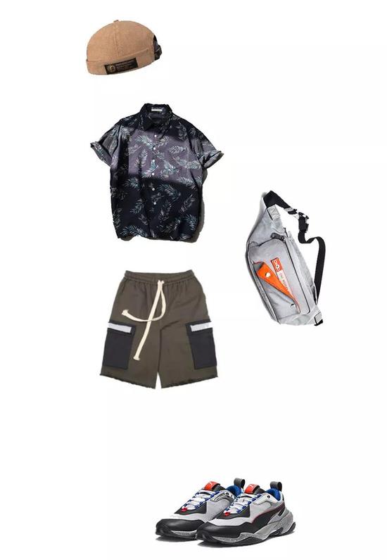 与牛仔裤的复古不同,夏威夷衬衫搭配休闲短裤更具休闲感。整体的的配色以蓝、绿的冷色调为主,像极了唱跳rap的酷酷男孩,其中灰绿色也是时下很火的配色,给人一种低调的清新感。