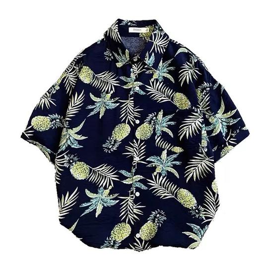 款一是深蓝色打底的菠萝印花衬衫,采用棉、麻、化纤混纺而成,吸收了其中优点,轻盈透气;质量过关的同时价格还很实惠,性价比很高。