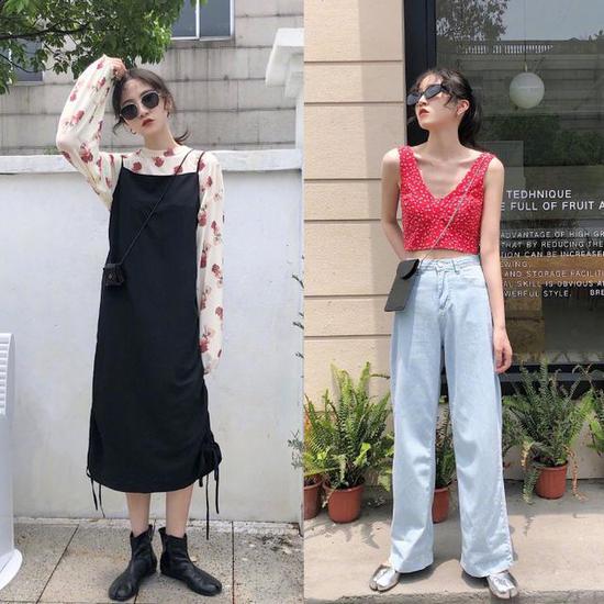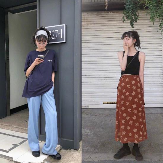 夏季比较适合休闲清爽的穿搭,首先面料的选择上要舒适透气,其次在款式上,可以选择宽松版型的T恤搭配天丝牛仔阔腿裤,潮流感与舒适感兼具。当然印花半身裙搭配黑色短裤背心,上窄下松的搭配清爽加倍。这两种搭配在色系上要注意深浅色系的有机组合,增加视觉效果。