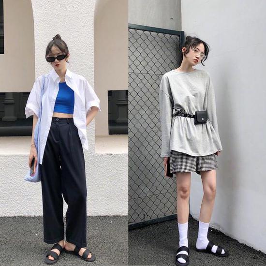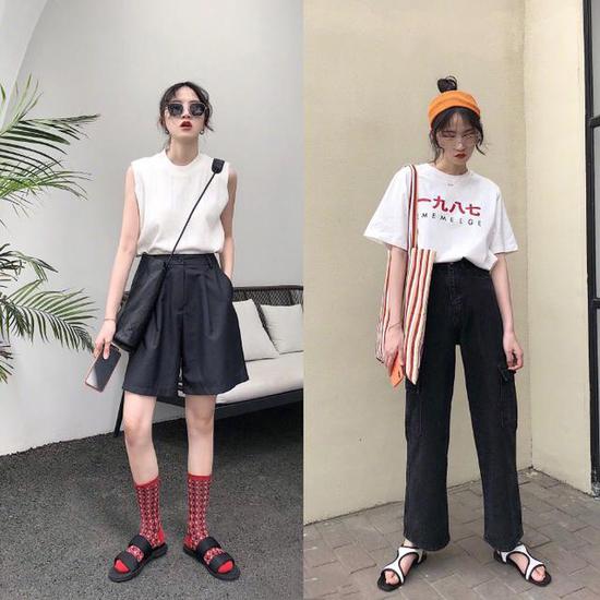 在夏季,经典的黑白配色也是十分潮流百搭的款式。简约的白色上衣,无论是无袖设计还是印字元素,都彰显潮流时尚感。在搭配上,可以选择黑色短裤,也可以搭配黑色阔腿裤牛仔裤,值得注意的是上衣的下摆要塞进裤头,这样更显高挑身材。下面搭配黑色或白色凉鞋,清爽舒适。一双红色格纹长筒袜或是红白条纹帆布包,都能起到很好地点缀修饰效果。
