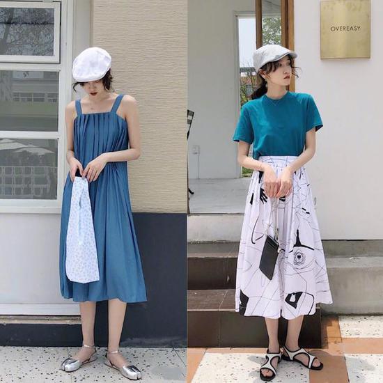 蓝色元素非常素雅纯洁,与夏天特别应景。蓝色吊带连衣裙是简约普通的单品元素,特别适合夏季出行。吊带设计露出精致锁骨的性感,与裙身细褶设计的精致感,无不彰显优雅气质。白色印花元素的半身裙宜搭配深色系的短袖T恤,这样配色的饱满度突出,适合夏季清爽风。值得注意的是,夏季出行别忘了搭配帽子,既能这样防晒,还能增加时髦感。