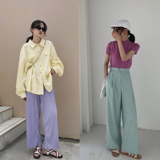 长裤阔腿裤是夏季搭配不可或缺的单品元素。阔腿裤挺阔有型的裤型舒适透气,同时兼具时尚的美感。夏季是个多彩的季节,因此在颜色上可以选择浅紫色或天蓝色这样的浅色系阔腿裤,清凉感倍增。当天阔腿裤比较百搭,上面可以搭配宽松版型的衬衫或T恤,值得注意的是,搭配T恤时一般要扎进裤头里,这样抬高腰线显高显瘦的效果更佳。