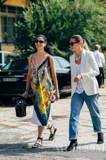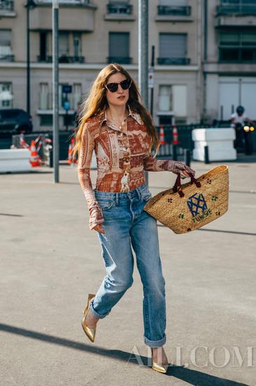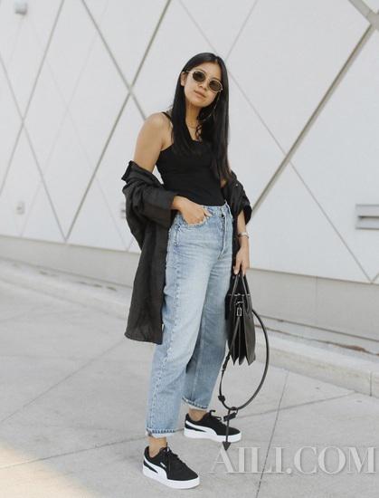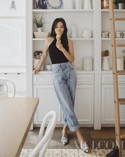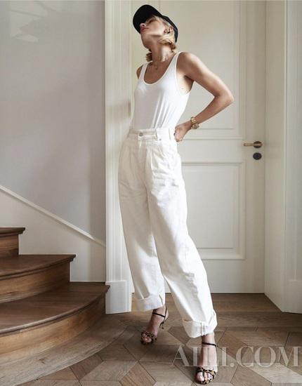 由于线条硬朗粗犷,老爹牛仔裤穿不好会显得有点邋遢,这时候选一件合适的上衣就很重要。可以学时尚博主为老爹牛仔裤搭配紧身吊带,纤细的上半身线条可以与牛仔裤的宽松廓形形成对比,还能强调出腰部线条。