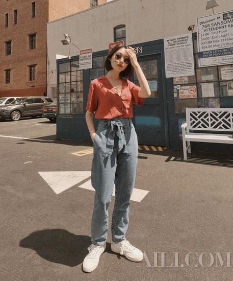 充满中性风的牛仔裤也可以加入一点女性化的设计,一条简单的腰带束在腰间,不用过多装饰就能让线条稍显温柔。