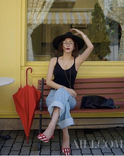 不管是长款或是短款的紧身吊带,都要将下摆束紧牛仔裤中,才能达到避免邋遢的穿搭目的。