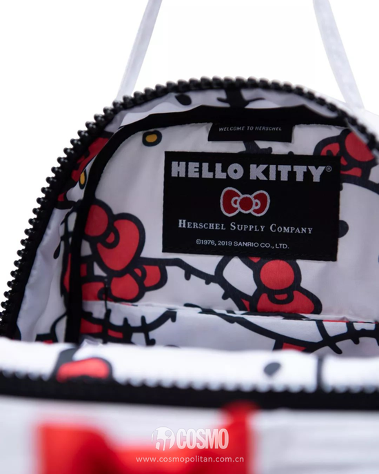 细节也很用心:包带有一个红彤彤的蝴蝶结装饰,包内布满夸张的Kitty印花,满足闷骚的少女心。