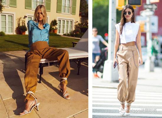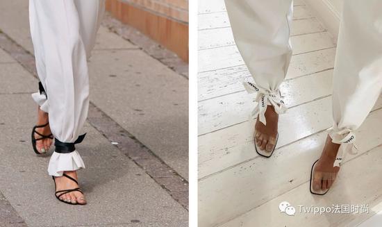 好多人,穿绑带凉鞋的时候,会顺带把直筒裤的裤脚绑起来,看起来就像变出了一款灯笼裤。