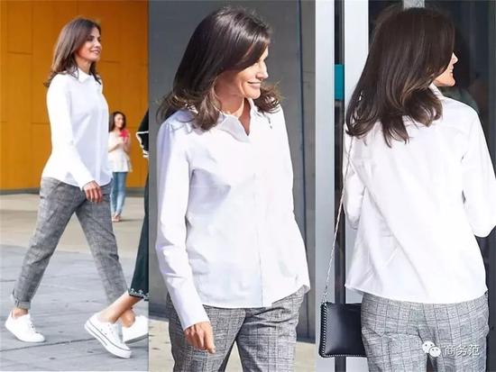 而莱后去医院探望老国王时,恰好也穿起了白衬衫。