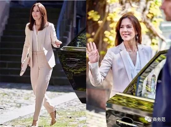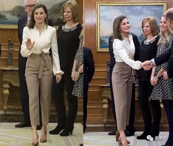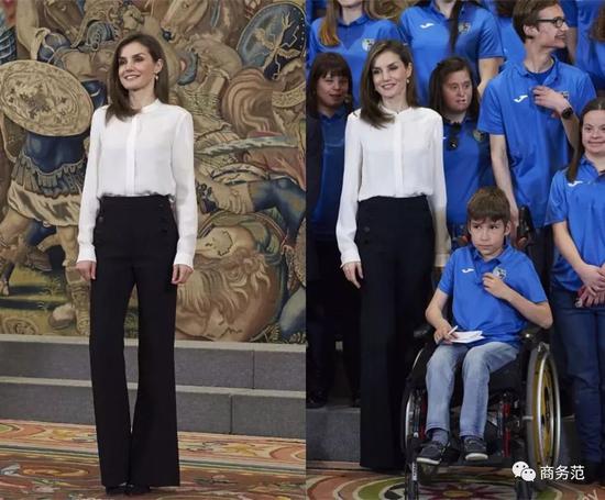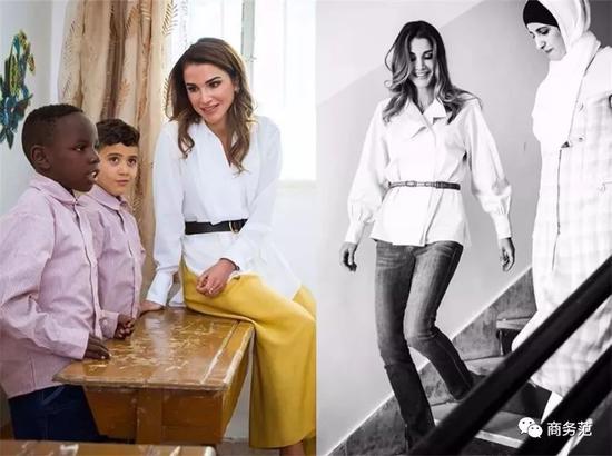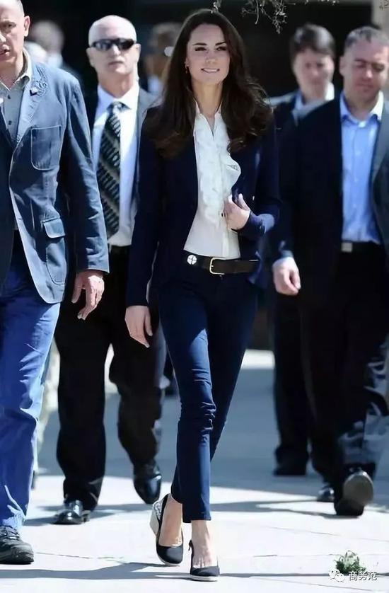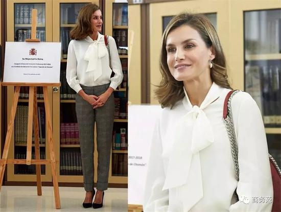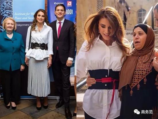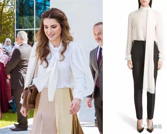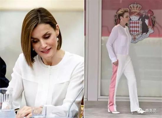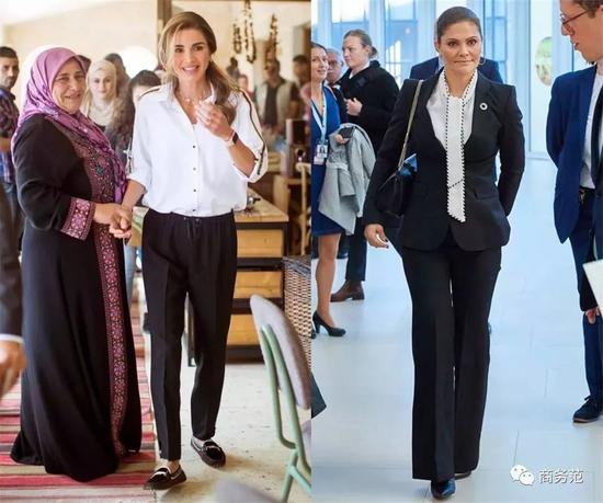 另外,如果遇到有颜色细节的白衬衫,在穿搭时还可以考虑配色呼应。比如约旦王妃用黑色裤子搭配上身带黑色纽扣的衬衫,瑞典维多利亚公主则穿靛蓝套装,搭配有蓝色“包边”设计的飘带~