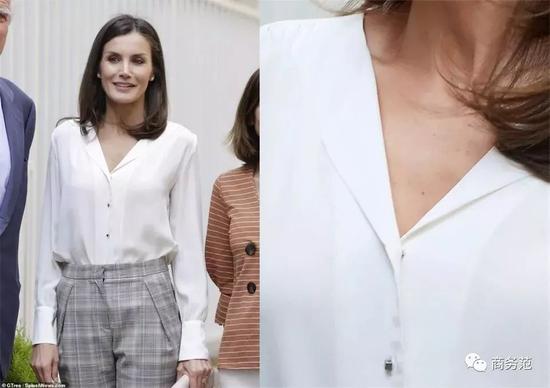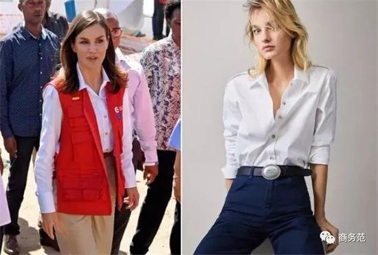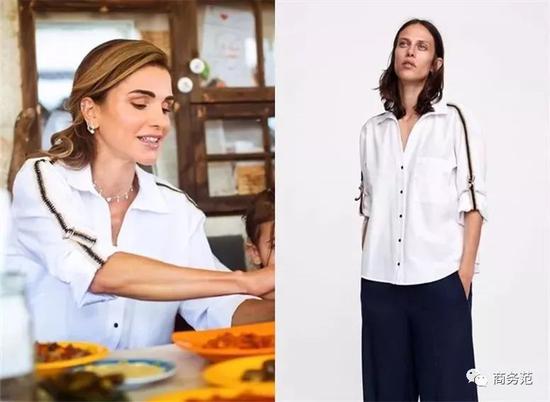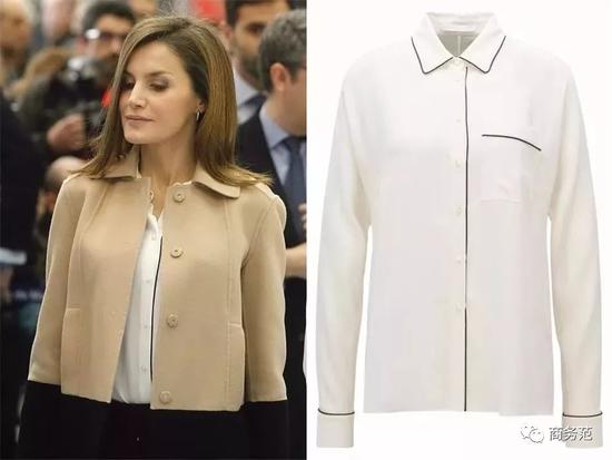 比如有细节的袖子,像约旦王妃这件Zara,手臂位置的金棕色细线设计,使得衬衫多了点硬朗感,日常在办公室穿还挺合适的。 ↓