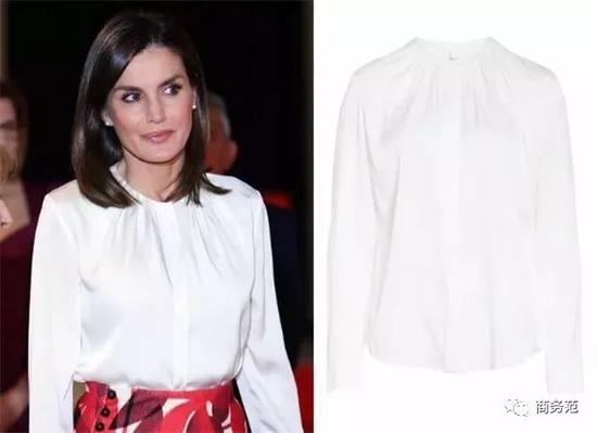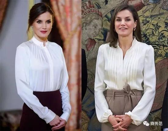 有些时候,王室女性们会穿一种小立领白衬衫。一方面是用于应对比较重要的场合,比如莱后就经常这么做。