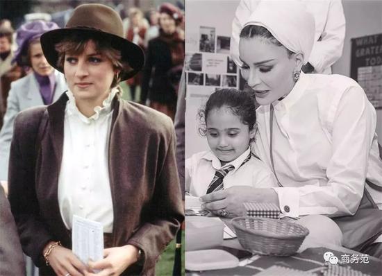 比如戴妃的这件,荷叶边的设计既复古又可爱,很贴合她全身的搭配。而卡塔尔王妃穿的,则是有点像中山领的设计,严肃中又显得别致,蛮符合她“时尚女强人”的人设。