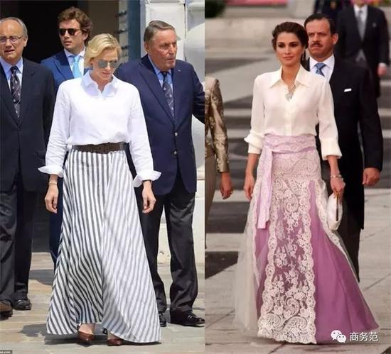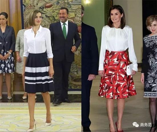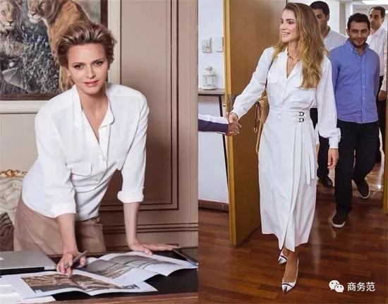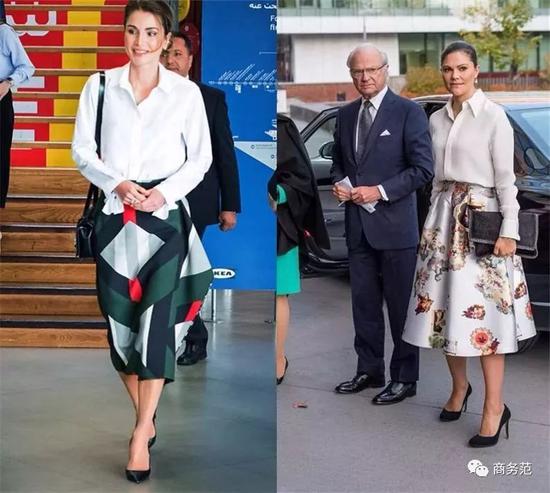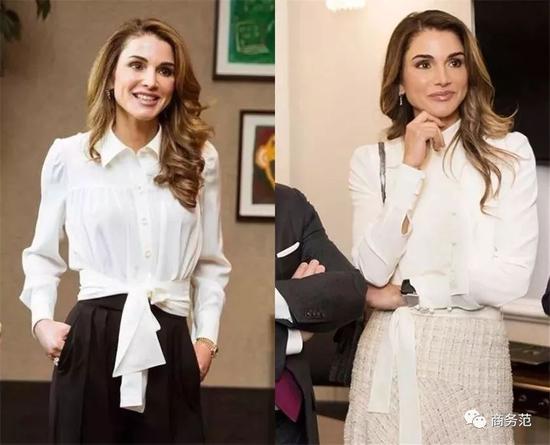 像夏琳王妃这一套,高挑的女生用于日常上班没问题,而像约旦王妃这一套,则可用于隆重场合,真丝衬衫和精致的长裙相得益彰。