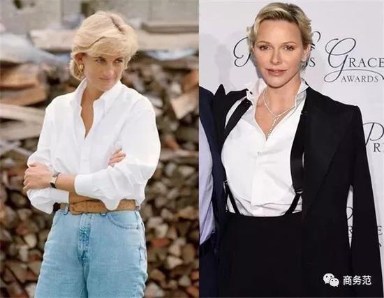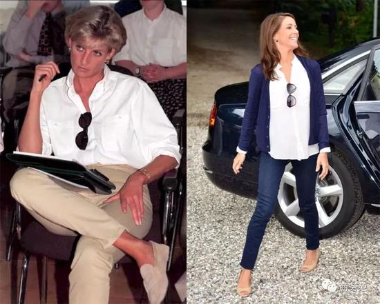 又比如戴妃和丹麦玛丽王妃,则都懂得用墨镜来给白衬衫加分,简单地别在胸前,恰当地点缀了造型。