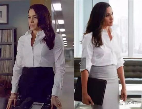 其次,如果不是贴身的款式,单穿的时候可以考虑适当地挽起袖子,因为看起来更干练,而且露出纤细的胳膊更显瘦。比如梅根,在《Suits》里同样是穿白衬衫,右边所呈现的效果明显比左边好得多。