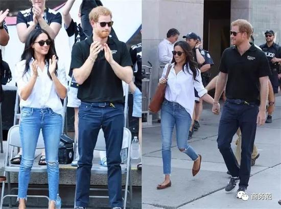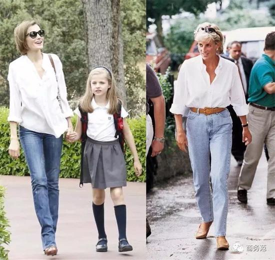 职场girl们其实可以考虑一下白衬衫+直筒裤子,你看同样是牛仔,戴妃的这身看起来要比莱后的修身裤要更时髦一些。