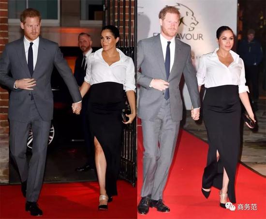 又或者梅根这身白衬衫+开衩黑裙+Aquazzura高跟鞋,即便是在孕期,也让她看起来颇有风韵。