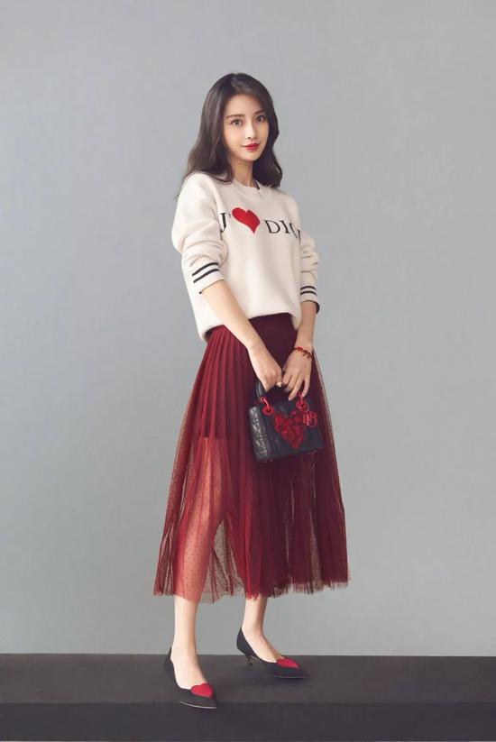 趁着还能再坚持露几天腿,各位爱美的小仙女们不妨像杨颖这样用毛衣配纱裙,虽然上下的厚度和质感完全不同,但同样温柔的款式叠加,真的是女人味十足。当然,这身造型换成马丁靴也同样适用,但猫跟鞋的魅力真的是其它鞋子无法企及的。