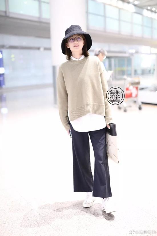 大地色系基本上是不挑人的颜色,虽然没有驼色那么普遍,但也很好穿。乔欣在毛衣里面搭配白衬衫,再加上渔夫帽,文艺清新感立显。