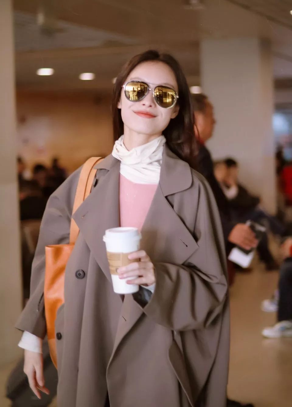 倪妮的廓形风衣是秋冬必备,粉色内搭更显年轻。