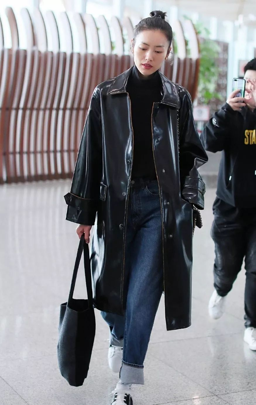 刘雯的皮革风衣独树一帜,带来全新风格,又飒又酷。