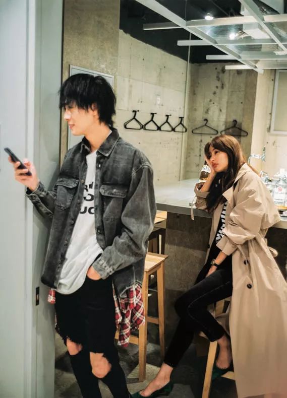 双排扣风衣与连帽衫的叠穿,