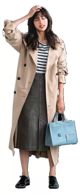 娴熟风衣造型,选择紧身裙搭配乐福鞋,条纹图案上衣增添亲切感。