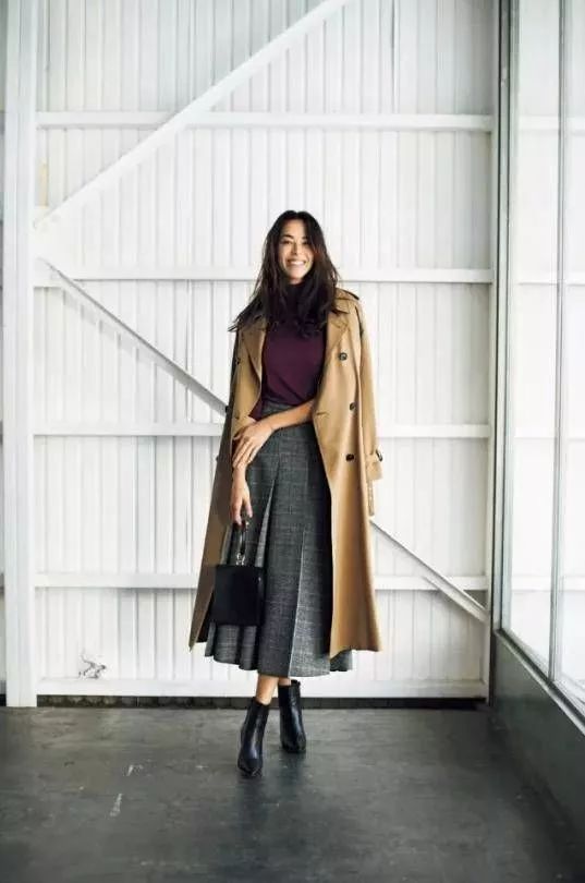 柔软的裹身针织连衣裙与硬朗的双排扣风衣搭配,