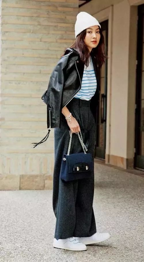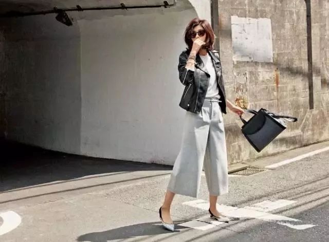 齐及脚踝的阔腿裤搭配平底鞋,可以显出女性的从容感。
