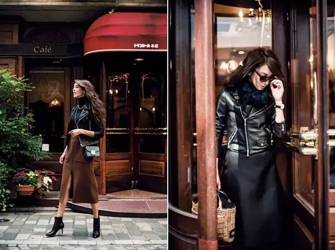 长款裙裤搭配短款机车皮衣